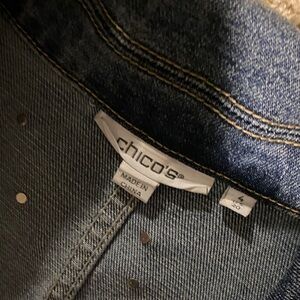 Chico's denim jacket with pearl-like stud embellishments. Classic blue hue. Ideal for casual wear. Brand new! Never worn!