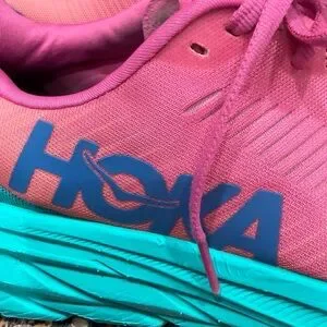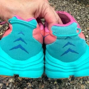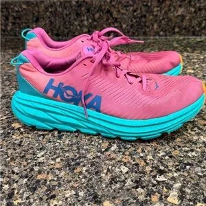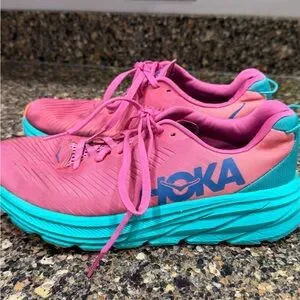 Dynamic Hoka sneakers in bold pink and teal. Ideal for running. clean and from a smoke-free home nice preowned condition. Normal signs of usage.