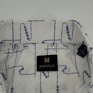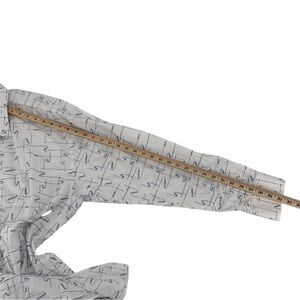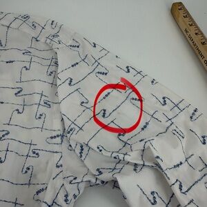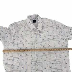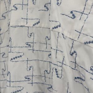 Casual button-down shirt with abstract blue lines on white. One small stain on the sleeve that is circled in red on last photo. Ideal for versatile wear. This is a very luxurious shirt. 100% Cotton.