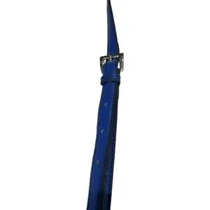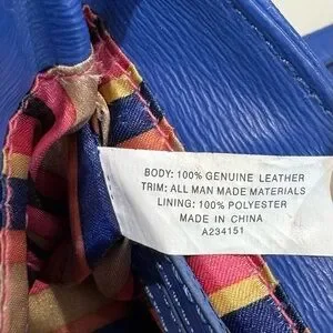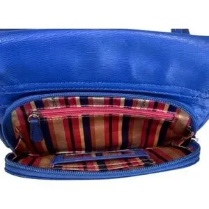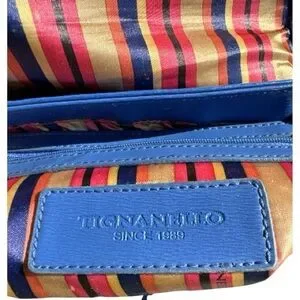 This Tignanello leather bag has a brilliant blue color, fun striped lining & solid silver toned metal hardware bearing the Tignanello name. Adjustable strap. Front flap has two buckle magnetic closures. Inside there are two compartments and on the inner back side there is a zipped pocket with a leather label that reads Tignanello Since 1989. On the back of the purse there is another zipped pocket with an area for credit cards and an additional zipped pocket inside. Tignanello is known for their quality craftsmanship, making handbags of genuine leather.