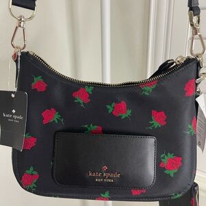 Chic and stylish, this Kate Spade bag features a striking black design with vibrant red floral accents. Perfect for adding a touch of elegance to any outfit.