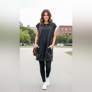 Discover effortless style with this casual charcoal sleeveless tunic dress. Perfect for versatile wear, it combines comfort with a chic look.