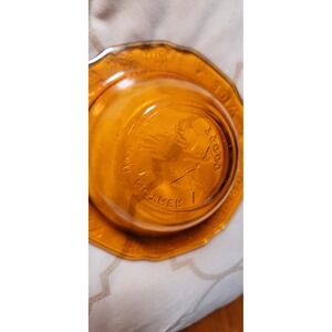 Amber Glass bowl with Miss Muffet, Mother Goose, Little Bo Peep and the Three Blind Mice measures 6" diameter and 2" height.