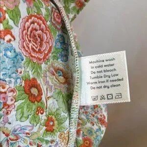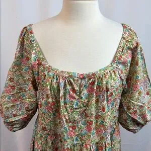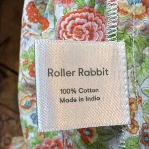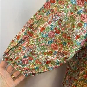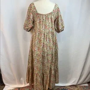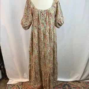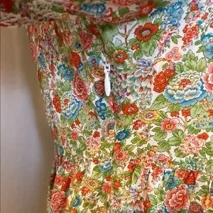 Vibrant floral maxi dress by Roller Rabbit. Features a mix of red, orange, green, and blue flowers. Perfect for a stylish, colorful look.Cottagecore