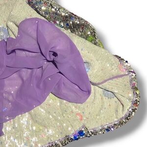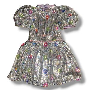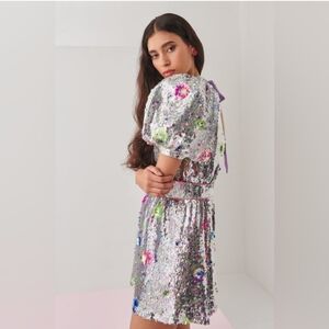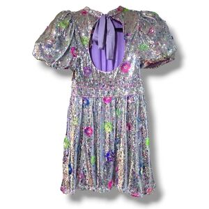 Shimmering silver mini dress. Features vibrant floral accents. Puff sleeves add elegance. Perfect for standout occasions. Never worn. NWT