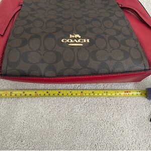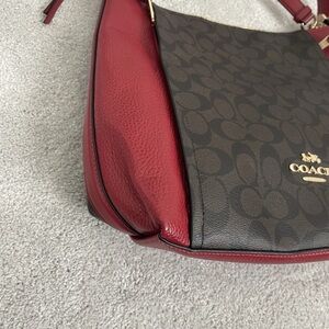 This is used but in excellent condition Coach Marlon Hobo Dark Red & Brown Leather Shoulder Crossbody Bag Purse Handbag. Slight creases , but no major defects. Please see pictures for measurements. Coach Marlon shoulder bag with a bold red and brown pattern. Features iconic logo and adjustable strap. Perfect for daily use.