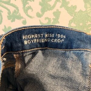 AE Highest Rise crop ankle jeans in a 90’s boyfriend fit. Neat seam detailing, unique front and back pockets, and a simple embroidered “AE” instead of the classic back pocket design. Zipper fly. Minimal stretch. Lightly worn; small white spot on front left leg (first two photos). Smoke free, pup-friendly home.