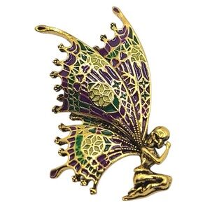 Gold tone brooch featuring a fairy with intricate green and purple enamel wings. Perfect for adding a whimsical touch to any outfit. Measures approx 2” NWOT