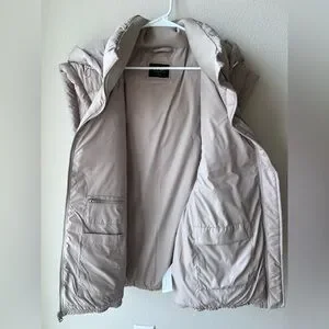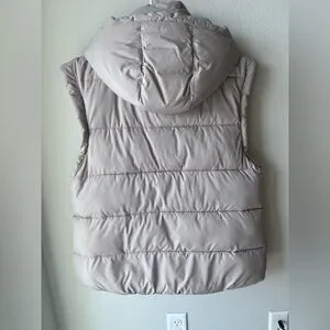 Stay warm and stylish with this light gray puffer vest. The hood on this vest is detachable with a zipper. There are very small puncture holes on the bottom of this vest front and back but not super noticeable.