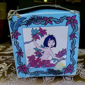 The box is light blue with images of vines and the words "Jungle Book" and "Collector Series" printed on it. This glass is part of a set of collector's glasses released in 1994 to promote the movie. These glasses were available at Burger King restaurants as part of a promotional campaign in collaboration with Coca-Cola and Disney.