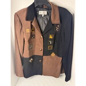 Embrace a bold and artistic statement with this striking Nancy Bolen City Girl blazer set. The jacket captivates with its unique patchwork design, artfully combining rich brown and deep black hues, accented with intriguing animal print and textured square appliques. A decorative stitched trim adds a touch of handcrafted charm to the lapels and collar, while two prominent buttons secure the front. Beneath, a sleek black top with a subtly textured finish and a decorative stitched neckline completes the ensemble. This set is perfect for making a memorable impression at an art gallery opening, a stylish dinner date, or a creative networking event.