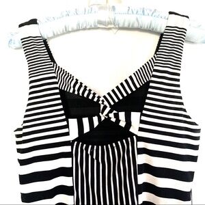 Darling Fully Lined Black and White multiple stripe Dress!! Soft Rayon 94% Spandex 6%. Excellent condition!! Very Well made! Cute twisted strap detail in the back💕You might want to wear your hair up when you wear this cutie!!