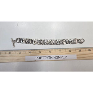 This is a pre-owned Brighton silver-tone bracelet featuring interlocking heart-shaped panels alternating with sections of beaded and braided designs. The bracelet has a toggle clasp closure. It measures approximately 7.5 inches (19.1 cm) in length, as indicated by the sizing cone and ruler in the images. Visible signs of wear include some minor tarnishing or discoloration consistent with a pre-owned item.
