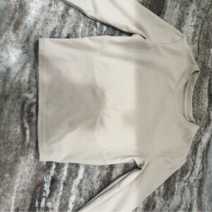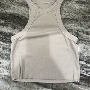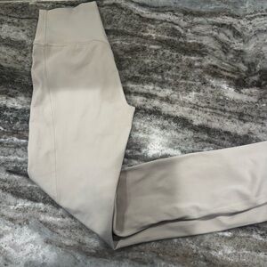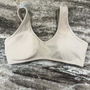 Stylish beige activewear set including a zip-up jacket, sports bra, and leggings. Perfect for workouts.