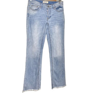 FEATURES: low to mid rise; straight leg; raw hem; 5 pocket; whiskering/fading; seam detailing; back button flap pocket