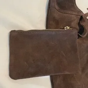 Elegant, genuine brown suede hobo handbag with a suede pouch attached. Perfect for any occasion.