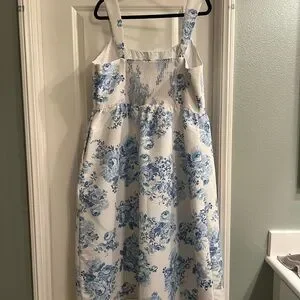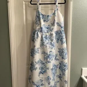 Chic dress with blue floral design. Ideal for stylish outings. Runs small, it’s an 18W but fits more like a 14/16. Warm only once.