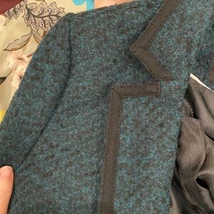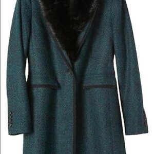 Stunning piece! A beautiful textured long coat with black piping on edges. Faux Fur not included