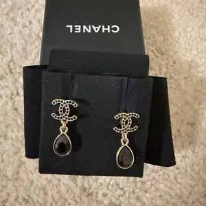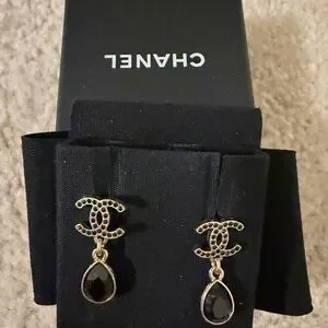 These are Chanel black teardrop earrings with iconic gold accents. From the year 2022. These earrings are crafted of gold metal Chanel CC’s with black crystals and a larger crystal underneath.
