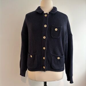 Substantial 100% cotton sweater/jacket from Alex Mill, featuring collar and buttoned patch pocket details, in navy blue.