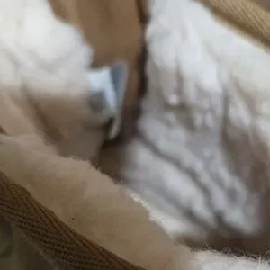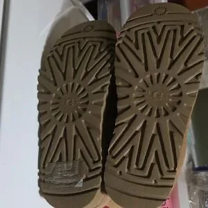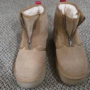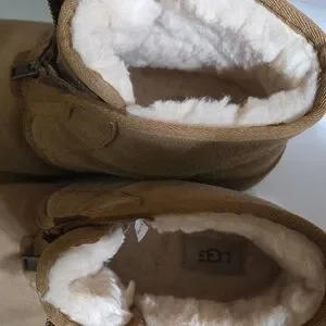 Stylish UGG ankle boots. Tan suede exterior. Cozy white lining. Red pull tabs. Durable zippers. Only worn a couple times