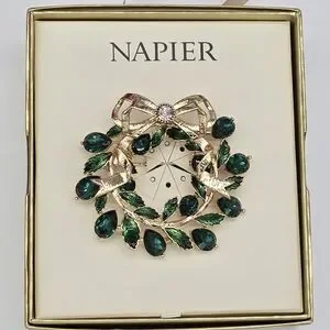 Elevate your ensemble with this stunning wreath pin from Napier, featuring a bouquet of rich emerald green accents surrounded by delicate leaves. Its charming design and nickel safe finish make it a delightful addition to any outfit, perfect for adding a touch of vintage elegance and sparkle.