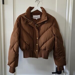 Stay warm and stylish with this brown puffer jacket. A cropped silhouette with chevron quilting and gold hardware, this jacket is perfect for any occasion.