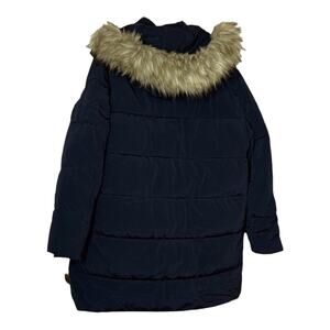 Zara Puff Parka With Faux Fur Hood in a size XL. Has two chest lined zipper pockets and two front lined pockets. Full front zipper with outer full front snaps. Removable hood with drawstring toggle and two snaps.One sleeve zipper pocket and two inner pockets. Ribbed inner cuffs. Fully lined. Measures approximately 26" armpit to armpit, and 35" in length. Outer shell 93% nylon, 7% elastane. In great condition.