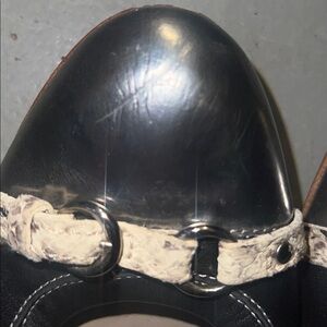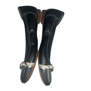 Elegant black shoes with cream accents. Features a stylish buckle detail. Perfect for any occasion. Good condition normal signs of wear.