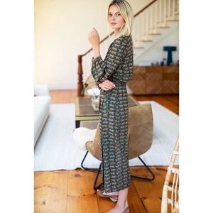 From Emerson Fry’s limited India Collection, this Bishop Dress is hand block printed in Rajasthan using low-impact dyes. Crafted from 100% modal, it offers effortless drape and comfort in a stunning rust-and-forest green artisan print. Designed with an adjustable wrap waist, puff shoulder, and full bishop sleeves with button cuffs — this piece blends bohemian charm with timeless sophistication.