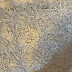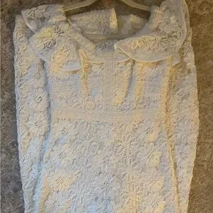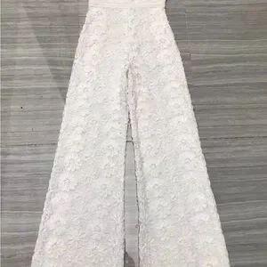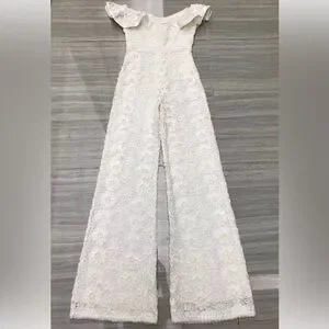 This cream jumpsuit by Alexis features a wide-leg style that flows gracefully, complemented by delicate floral lace and cap flutter sleeves. The fitted bodice transitions smoothly into the pants, offering a sophisticated and romantic silhouette perfect for formal occasions.