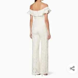 Pretty off-the-shoulder jumpsuit from Alexis featuring an off the shoulder design, short flutter sleeves, a fitted silhouette, a wide leg design, a concealed rear zip fastening. It also features a ruffle detailing at the neckline, a scalloped trim at the legs and an all-over floral lace pattern.