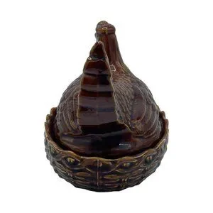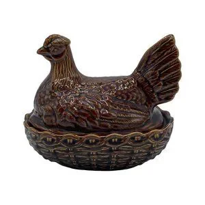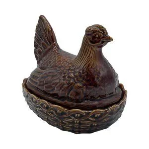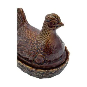 Classic mid-century brown glazed ceramic hen on nest in the classic Portmeirion design w/highly detailed nest & mama hen w/2 chicks nestled at her breast (see pics, 11th pic), BUT atypically (for Portmeirion) unmarked. Thus the ?s. Like new & believed to be the mid-sized (size 3 of 5 sizes) version (see below), & probably an older version of items made from 1963-1983. Perfect addition to your oven-to-table kitchen arsenal, a HON/Portmeirion collection or a desirable vintage kitchen/home decor piece.