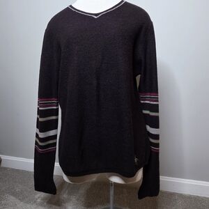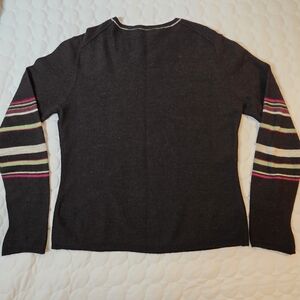 V-neck chocolate brown sweater with striped sleeves. Stripes are green, gray, magenta. Gently pre-loved. Measurements in pics. 100% merino wool.