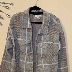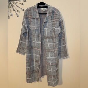 Long Open Front Gray Plaid Sweater Jacket with Pink Accents Size Large