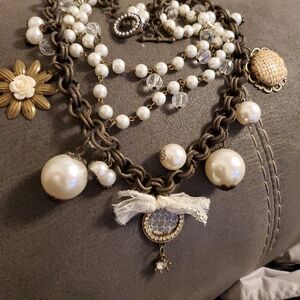 This beautifully detailed statement necklace features layers of luminous faux pearls, faceted crystal beads, and an antique bronze chain interwoven with vintage-inspired charm. A delicate lace bow, oversized pearl drops, and a mix of floral and textured medallions create a soft romantic look with a touch of boho elegance.