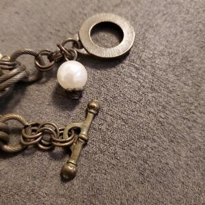 Materials: Faux pearls, lace, bronze-tone metal, glass beads