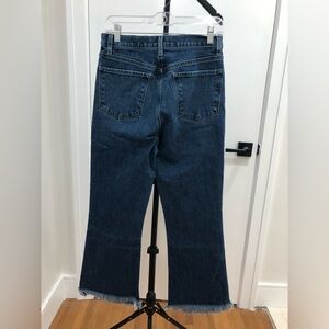 Chic high rise blue jeans with a flare leg. Features a stylish frayed hem. Perfect for a modern look. Size 28. Measurements are shown in pictures.