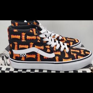 Published monthly in San Francisco, CA since January 1981, Thrasher is the longest-running, best-selling skateboard magazine of all time-its name synonymous with both skateboarding's roots and constant evolution. With a staff dedicated to defining this evolution and the adventurous spirit of their readership, Thrasher has continued to grow beyond the page. Today, it's bigger and better than ever. Teaming up with other Vans for a new exclusive collection that celebrates both brands' storied histories, the Vans x Thrasher Sk8-Hi showcases Thrasher's iconic flame logo on our legendary high-top silhouette. Made with 10 oz canvas uppers, this sidestripe shoe celebrates two of the most iconic names in skateboarding with classic "Off The Wall" style. • Vans x Thrasher collection • Vans' legendary high top, sidestripe shoe • Sturdy 10 oz canvas uppers • Allover Thrasher flame logo • Lace-up closure • Re-enforced toe caps • Supportive padded collars • Signature rubber waffle outsoles.