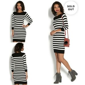 keywords: autumn, fall, winter, cold weather, mid-thigh, mini dress, sweater, knit, rib, ribbed, stripes, striped, stripe, black and white, 3/4 sleeves
