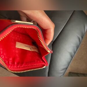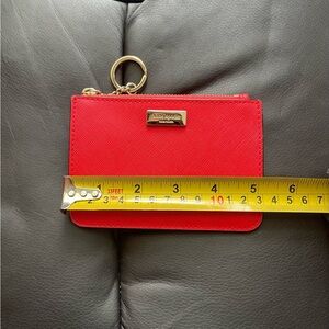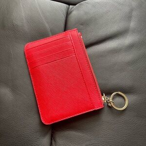 KATE SPADE Laurel Hill Card Holder w/ Key Ring, in geranium red color, saffiano leather material with gold accent hardware, 4 card slots and 1 large card slot, zipper closure with key ring attached, measurements as shown in the pictures. Pre-owned, in excellent condition.