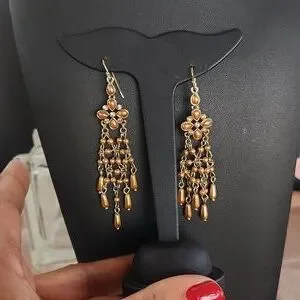vintage gold-toned chandelier earrings with brown or amber-colored beads and rhinestones.