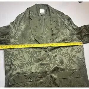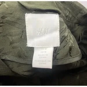 The H&M Trend Khaki Green Silky Palm Leaf Print Kimono Long Jacket in size M is a stylish and versatile piece perfect for casual occasions. Made from viscose, this jacket features a long length and a regular fit, making it suitable for the fall and spring seasons. The kimono style adds a trendy touch, while the palmp leaf print adds a unique flair to the design. Easy to care for with machine washable instructions, this jacket from H&M is a must-have for any fashion-forward woman's wardrobe.