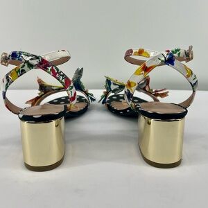 Stylish black heels with gold accents. Features colorful floral and butterfly embellishments. Ideal for making a statement.