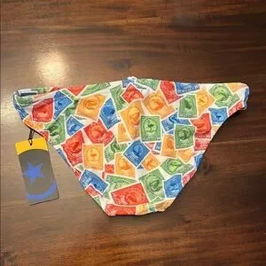 Vibrant swim briefs with a stamp print. Features a mix of red, blue, green, and orange colors. Perfect for a bold beach look.