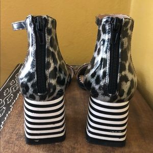 Stylish black heels with vibrant multicolor gem embellishments. Features a unique striped heel and ankle strap.