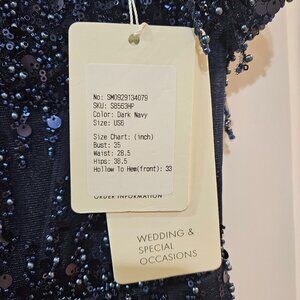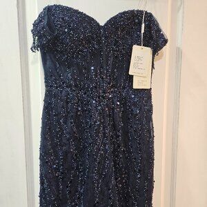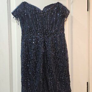 This glamorous mini dress features a rich, dark navy blue color and a fitted, off-the-shoulder silhouette. The bodice is structured with a sweetheart neckline and adorned with intricate sequin beadwork that cascades vertically, elongating the figure. Fringe-style beaded accents elegantly drape from the off-shoulder sleeves, adding movement and sparkle. The design continues down the dress with shimmering embellishments that enhance the fitted look, while a subtle front slit adds a touch of allure. The back is finished with a concealed zipper and maintains the beaded motif, offering a cohesive and dazzling appearance from every angle—a perfect show-stopper for homecoming or any formal occasion.