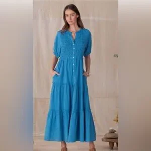 Chic midi dress with button-down front. Features short sleeves and a textured bodice. Ideal for versatile styling.