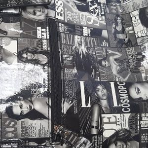 This purse is a conversation piece. Pictures on purse are of different starlets (Victoria Beckham, Kim Kardashian, JLo and more) Just a fun piece to have. Purse has pockets at each end and a zipper pocket on the outside. Inside has two zipper pockets (zipper pull is missing on one of the zippers. I pulled too hard and it came off but zipper still opens and closes (see video).. Two pockets for cell phone etc. Gold coloured hardware, Measures 12 inches wide and 12 inches high.Vinyl. Make me a offer.