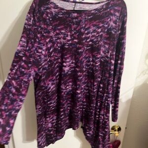 Eye-catching tunic with a dynamic pattern. Beautiful Shades of purples and pinks. Longer on sides. Perfect for a bold look. This is a 22/24 1X by Roamans. This size in this brand is like a 3X.